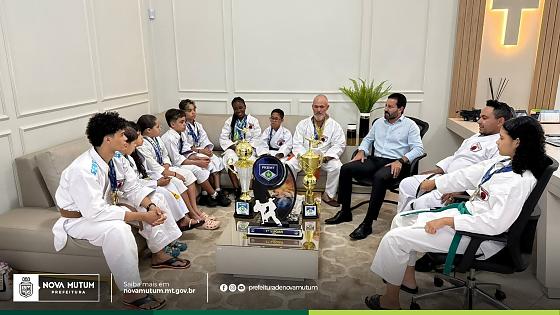 O prefeito Leandro Félix recebeu no gabinete municipal nesta quarta-feira (12.nov.2025) os atletas da Academia Seishin para celebrar a conquista do tricampeonato estadual de karatê 2025. Essa vitória não apenas reafirma a excelência esportiva de Nova Mutum, mas também fortalece a identidade da cidade como celeiro de talentos comprometidos com disciplina e superação.