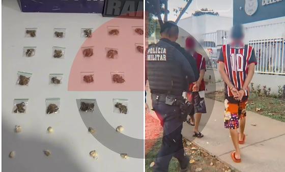 Após informações de moradores, os policiais realizaram buscas em uma calçada indicada e encontraram mais 20 porções de maconha e 12 pedras de pasta base escondidas entre plantas e lixeiras. Os dois suspeitos ambos menores de idade foram detidos e encaminhados à Delegacia de Polícia Civil.
