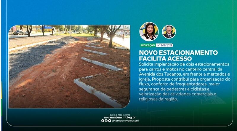 Com o objetivo de melhorar o fluxo de veículos e oferecer mais segurança e comodidade aos moradores e comerciantes, a vereadora Bia Kohler (UNIÃO BRASIL), com coautoria do vereador Lucas Badan Faria (União Brasil), apresentou a Indicação nº 305/2025, que solicita à Prefeitura Municipal de Nova Mutum a implantação de dois estacionamentos para carros e motocicletas no canteiro central da Avenida dos Tucanos, no bairro Residencial das Palmeiras.